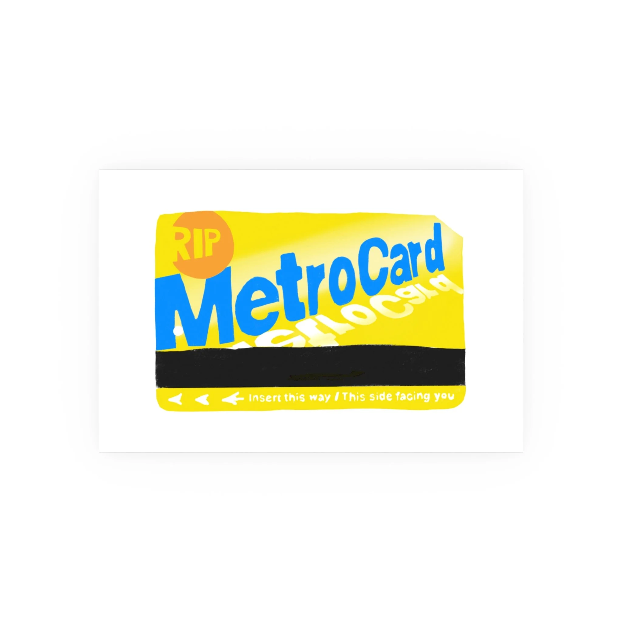 A nostalgic tribute to the iconic yellow-and-blue NYC MetroCard, featuring the familiar design that swiped millions of New Yorkers through turnstiles for nearly three decades. This vibrant print captures the end of an era with a bold "RIP" graphic, celebrating the tactile memory every subway rider knows. Perfect for anyone who ever fumbled with the magnetic strip or kept a MetroCard as a souvenir from the city.